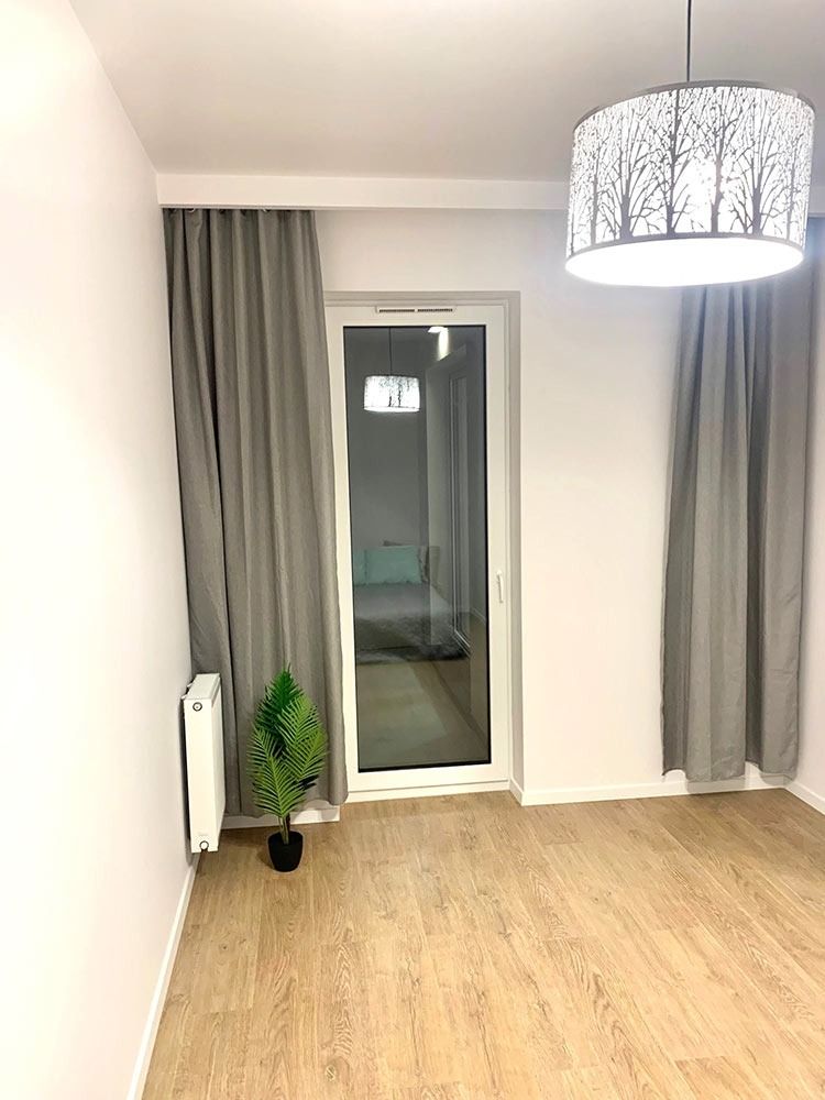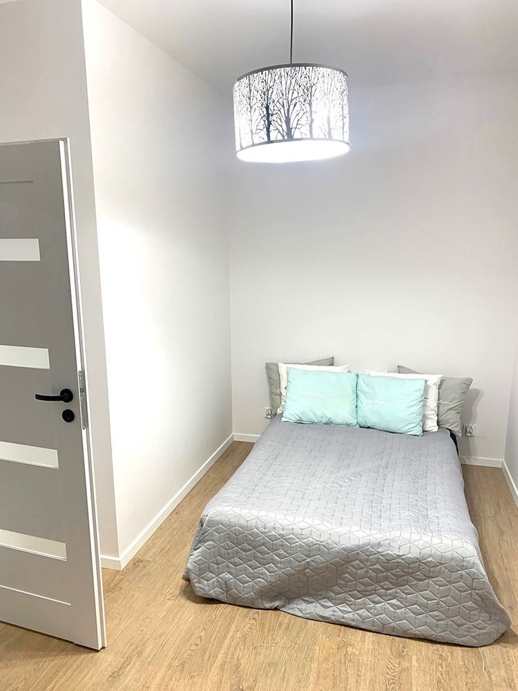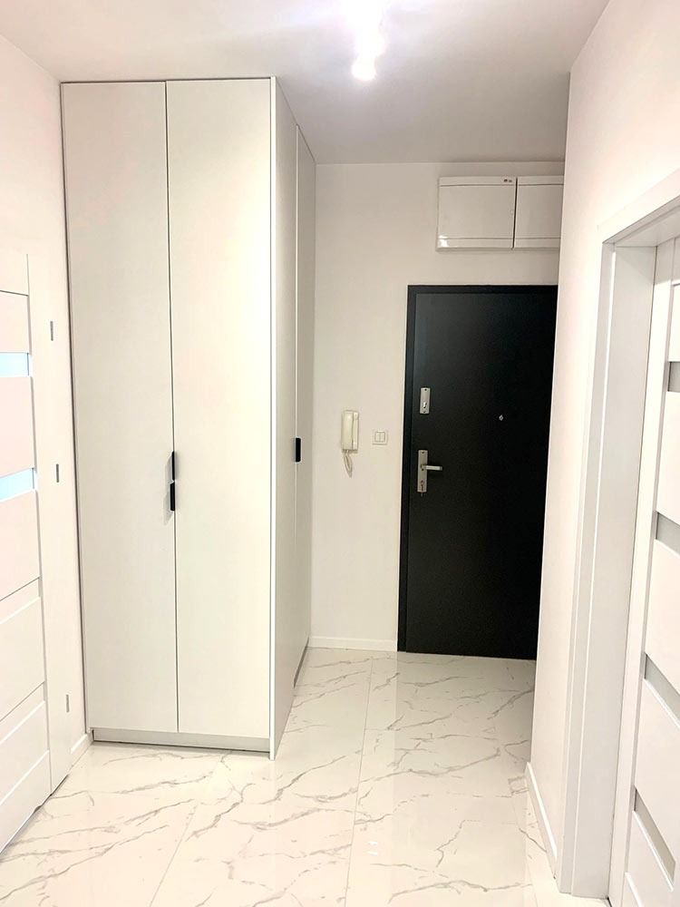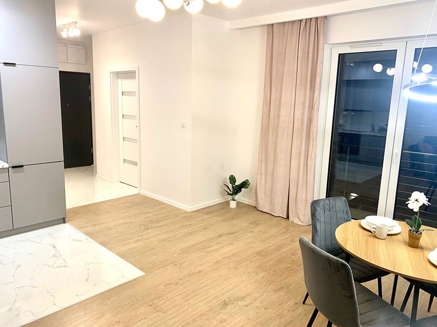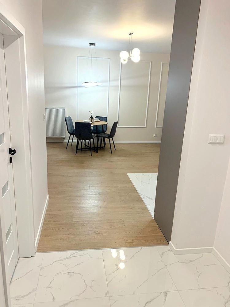 Mieszkanie zostało wykończone w bardzo wysokim standardzie. Podczas prac wykonano zabudowy z GK, szpachlowanie i gipsowanie, ułożono wysokiej jakości gres na podłodze w korytarzu i aneksie kuchennym oraz panele w części dziennej i w sypialni. W kuchni znajdują się wykonane na wymiar meble kuchenne. W zabudowie znajduje się sprzęt AGD: lodówka, zmywarka, piekarnik, płyta indukcyjna oraz okap podszafkowy. W łazience położno gres i glazurę, wykonano kabinę prysznicową z odpływem walk-in, jak również zabudowy meblowe na wymiar. Na ścianie w salonie znajduje się sztukateria. W lokalu znajdują się drzwi zewnętrze, antywłamaniowe. Zamontowano także oświetlenie w technologii LED oraz listwy przypodłogowe. W korytarzu zamontowano wykonaną na wymiar podwójną szafę.