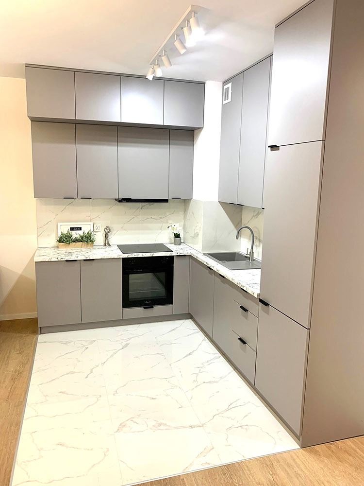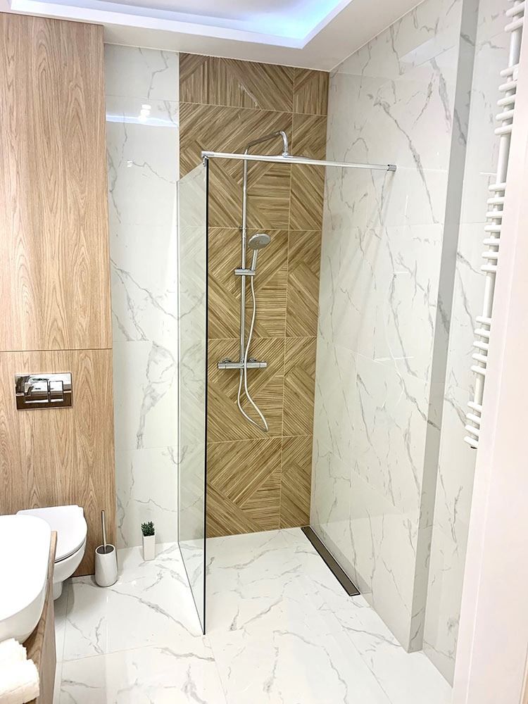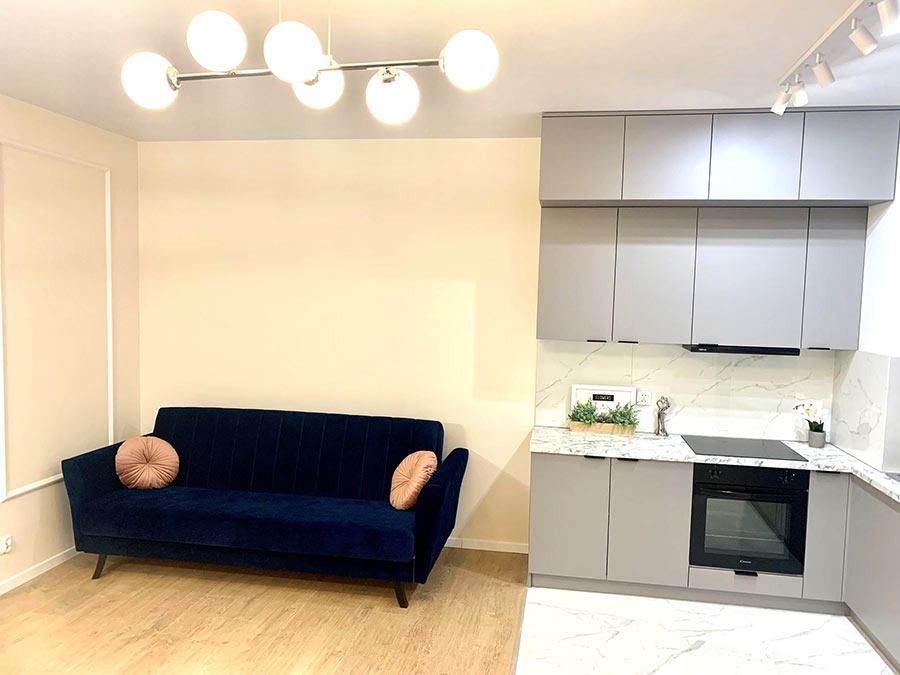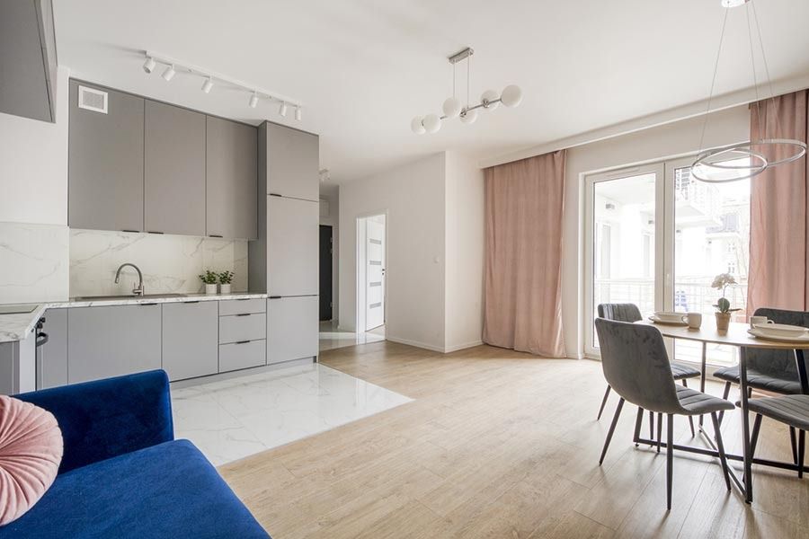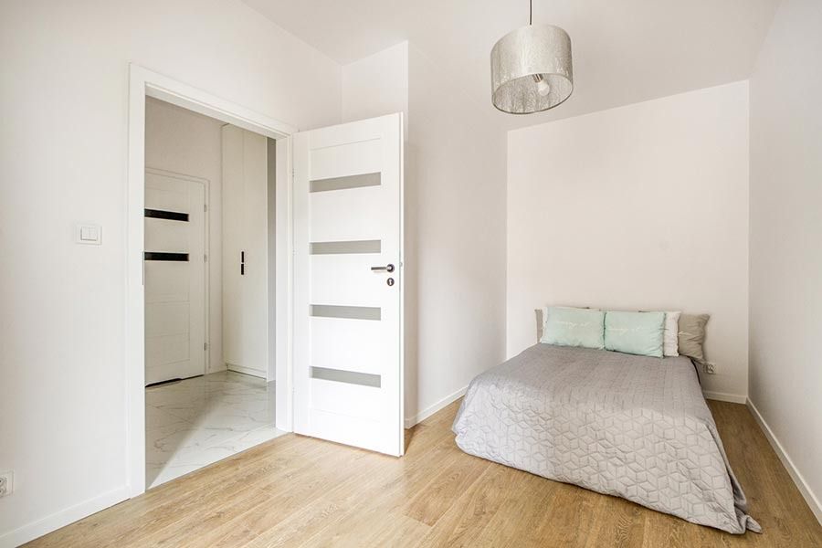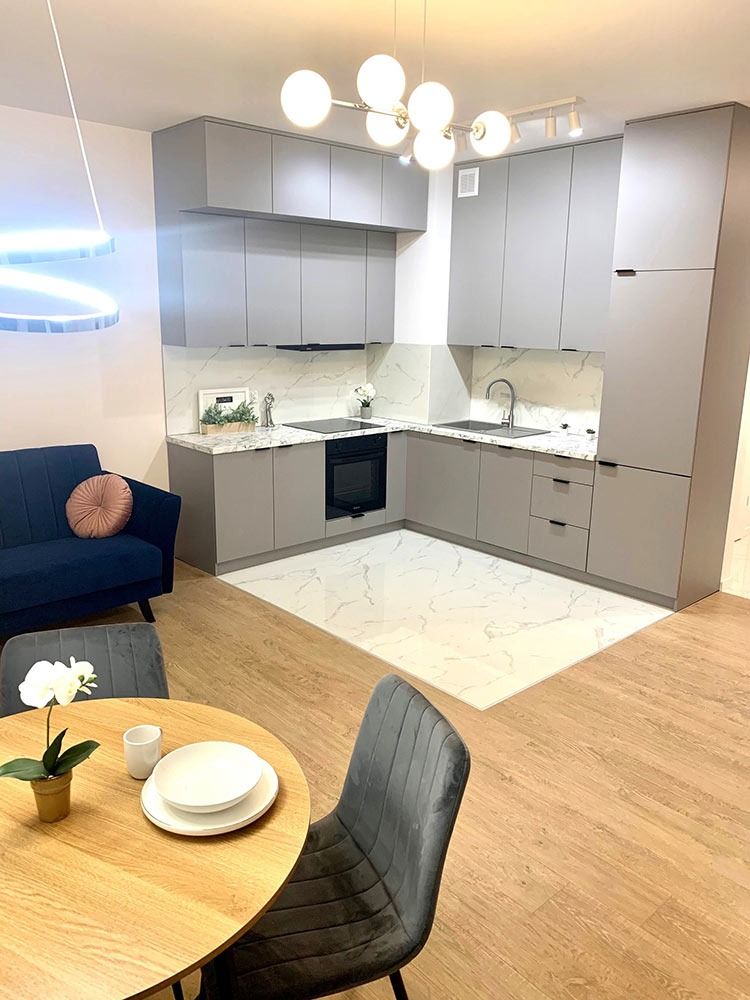 Mieszkanie zostało wykończone w bardzo wysokim standardzie. Podczas prac wykonano zabudowy z GK, szpachlowanie i gipsowanie, ułożono wysokiej jakości gres na podłodze w korytarzu i aneksie kuchennym oraz panele w części dziennej i w sypialni. W kuchni znajdują się wykonane na wymiar meble kuchenne. W zabudowie znajduje się sprzęt AGD: lodówka, zmywarka, piekarnik, płyta indukcyjna oraz okap podszafkowy. W łazience położno gres i glazurę, wykonano kabinę prysznicową z odpływem walk-in, jak również zabudowy meblowe na wymiar. Na ścianie w salonie znajduje się sztukateria. W lokalu znajdują się drzwi zewnętrze, antywłamaniowe. Zamontowano także oświetlenie w technologii LED oraz listwy przypodłogowe. W korytarzu zamontowano wykonaną na wymiar podwójną szafę.
