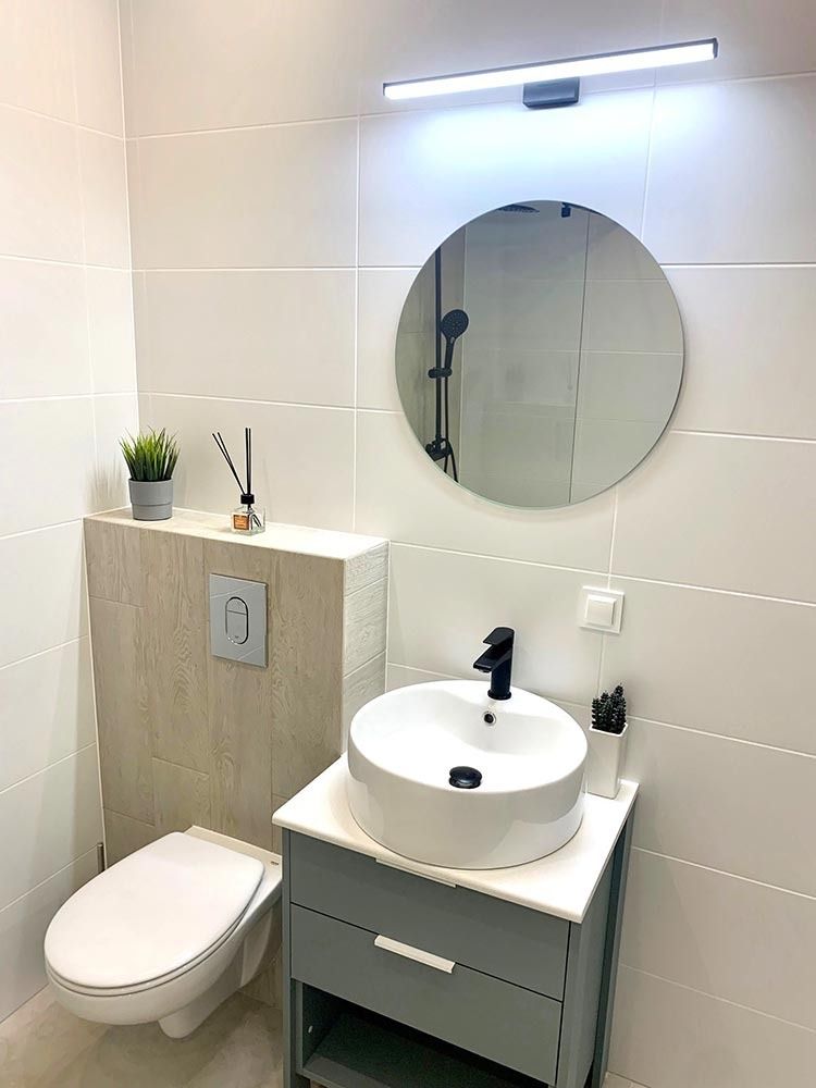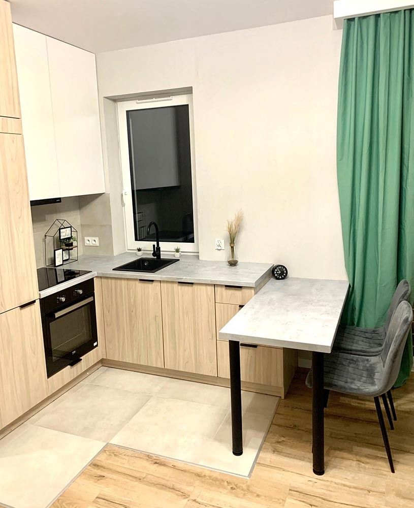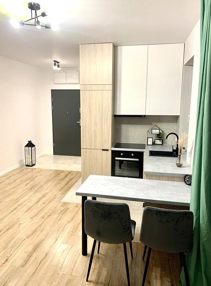 Mieszkanie zostało wykończone w wysokim standardzie. Podczas prac wykonano zabudowy z GK, ułożono wysokiej jakości gres na podłodze w korytarzu i aneksie kuchennym oraz panele w części dziennej. W kuchni znajdują się wykonane na wymiar meble kuchenne wraz z eleganckim betonem strukturalnym. W zabudowie znajduje się sprzęt AGD: lodówka, zmywarka, piekarnik, płyta indukcyjna oraz okap podszafkowy. W łazience położno gres i glazurę, wykonano kabinę prysznicową z odpływem walk-in, jak również zabudowy meblowe na wymiar. W lokalu znajdują się drzwi zewnętrze, antywłamaniowe. Zamontowano także oświetlenie w technologii LED oraz listwy przypodłogowe.