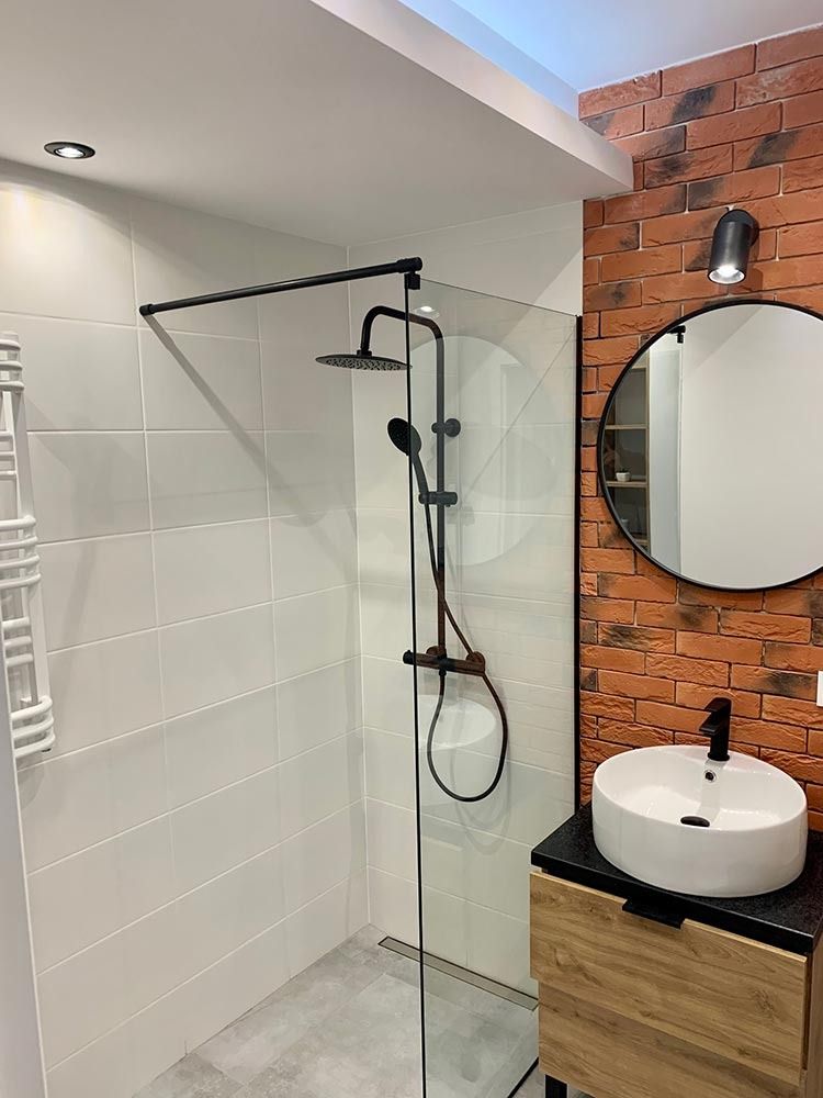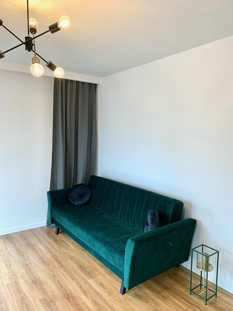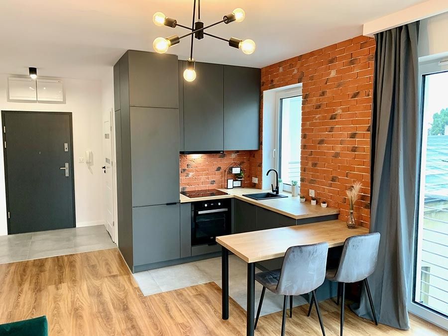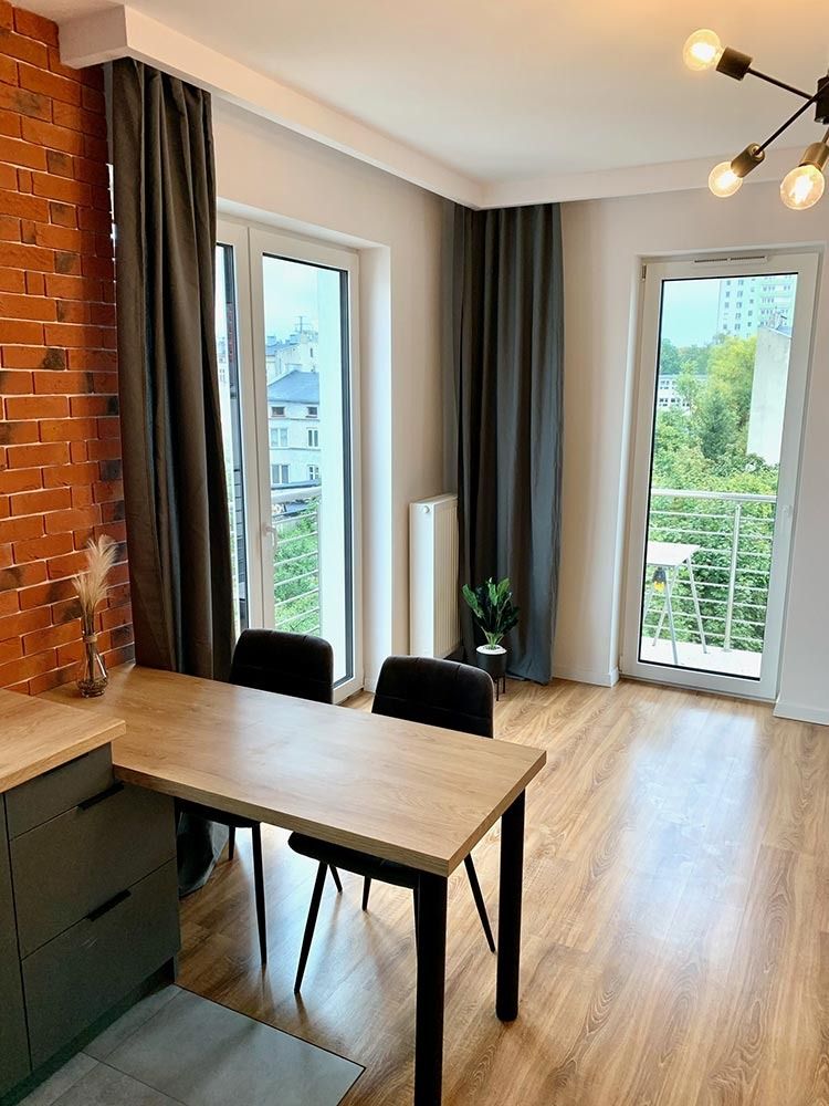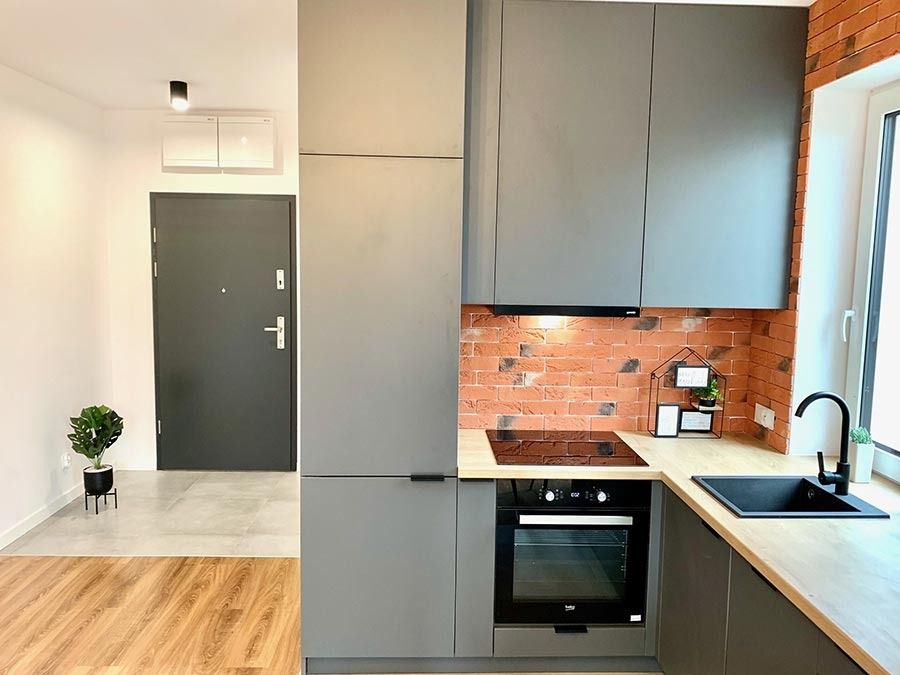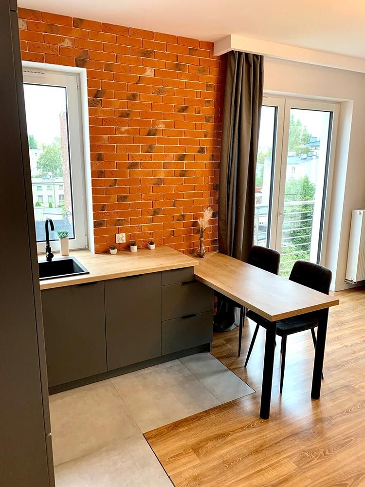 Mieszkanie zostało wykończone w wysokim standardzie. Podczas prac wykonano zabudowy z GK, ułożono wysokiej jakości gres na podłodze w korytarzu i aneksie kuchennym oraz panele w części dziennej. W kuchni znajdują się wykonane na wymiar meble kuchenne między którymi położono cegiełkę dekoracyjną. W zabudowie znajduje się sprzęt AGD: lodówka, zmywarka, piekarnik, płyta indukcyjna oraz okap podszafkowy. Łazienka w trakcie wykończenia, zakończenie prac przewidziano na koniec września. W lokalu znajdują się drzwi zewnętrze, antywłamaniowe. Zamontowano także oświetlenie w technologii LED oraz listwy przypodłogowe.
