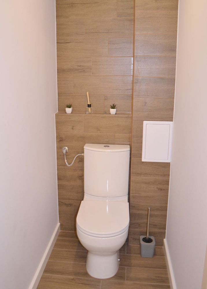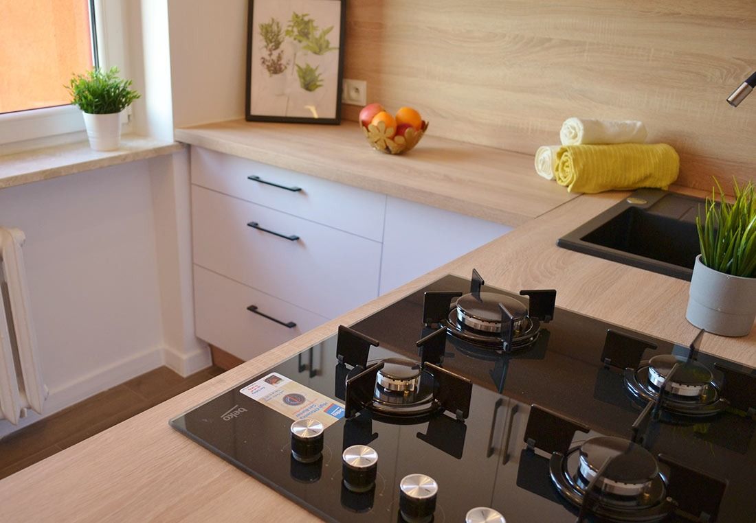 - nowe meble kuchenne, wykonane na wymiar przez zaprzyjaźnionego stolarza wraz z uchwytami Blum. Ponadto w kuchni zamontowano nowy sprzęt AGD firmy Beko -piekarnik elektryczny, płytę gazową oraz okap podszafkowy. Przygotowano również miejsce na pralkę do zabudowy.